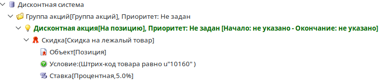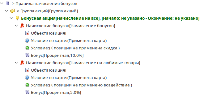 Алгоритм задания бонусных акций аналогичен алгоритму задания дисконтных акций. Отличием акций является применяемое воздействие:
