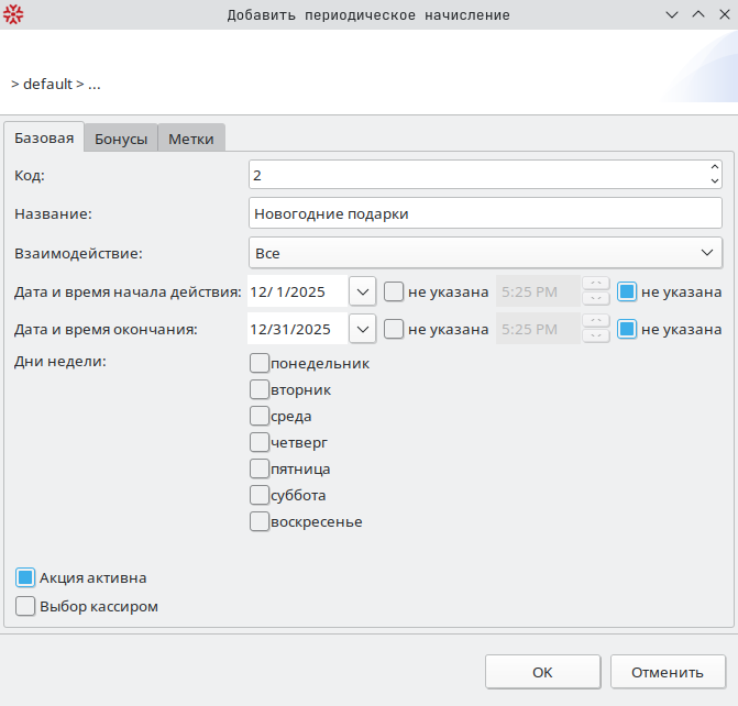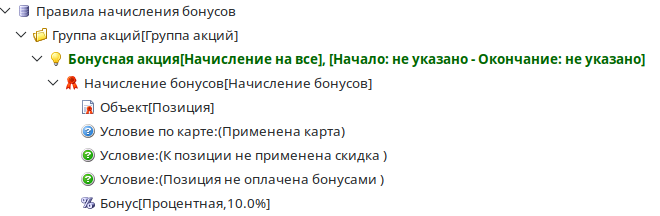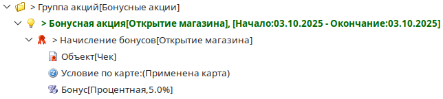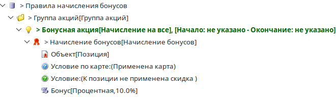 Акции, условия и ставки автоматического начисления задаются аналогично дисконтным и бонусным акциям. Особенностью автоматических начислений является невозможность использования объектов и функций, работающих с чеком. Автоматические начисления могут быть применены только в том случае, если покупатель является обладателем бонусной карты.