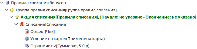 Правила списания бонусов определяют условия, при которых с карты покупателя могут быть списаны бонусные баллы, а также правила расчета ограничений количества бонусов для списания.