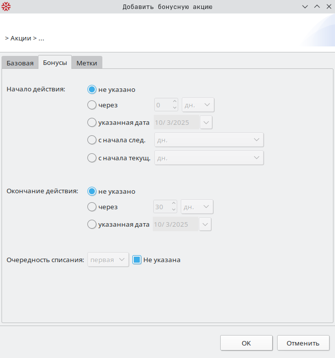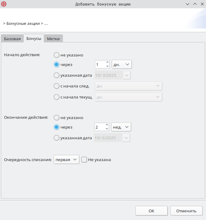 - Вкладка "Бонусы" используется для указания периода действия бонусных баллов и очередности их списания. Такой метод ограничения использования бонусов стимулирует покупателей совершать покупки в определенный период и увеличивает количество посещений торговой сети.