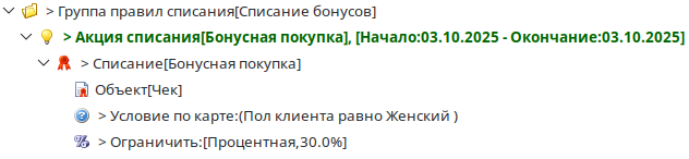 - В качестве объекта списания укажем чек, зададим условие "Пол клиента: Женский" и ограничим оплату бонусными баллами 30% от покупки.