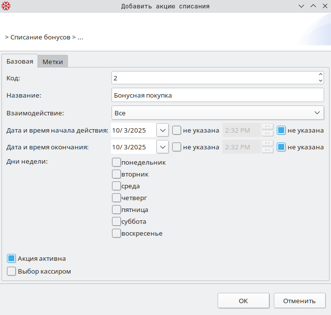 - Вкладка "Метки" используется для задания ограничения региона проведения бонусной акции. Подробнее об ограничении зоны действия скидок можно прочитать в разделе "Объектная система".