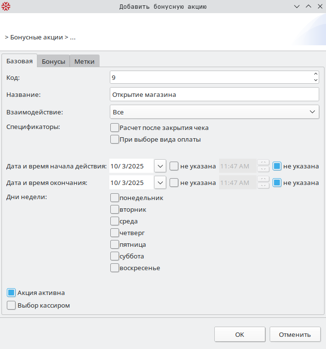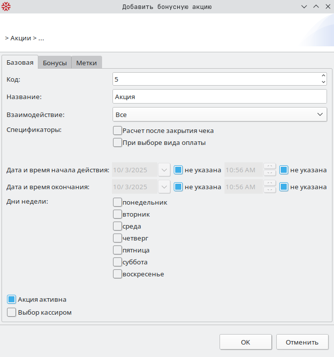 - Вкладка "Базовая" предназначена для описания основных критериев акции: