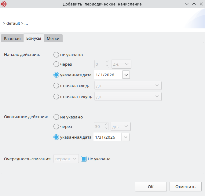 - Укажем период "жизнеспособности" бонусов и очередность списания: