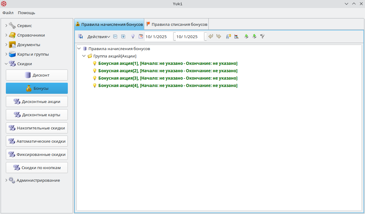 Бонусные программы задаются через пункт "Бонусы" раздела "Скидки" в утилите администрирования Yuki.