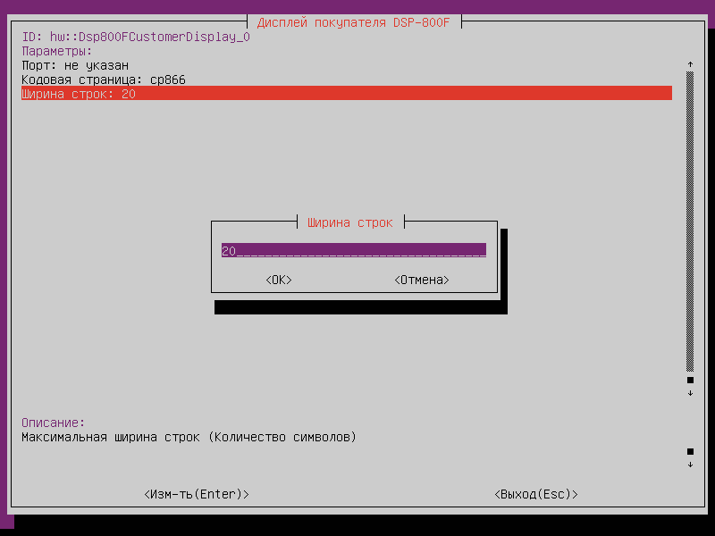 cp866илиcp1251. Кодировка может быть также задана вручную. При отсутствии параметра используется кодировкаcp866. - Ширина строк – предназначена для задания максимального количества символов, входящих в строку информационного табло. По умолчанию 20 символов.