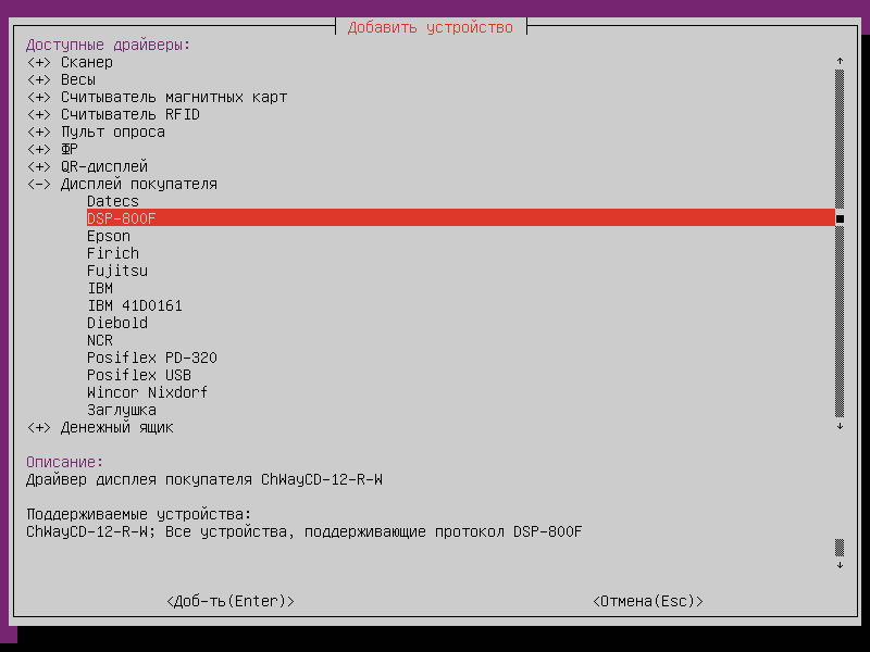 Драйвер DSP-800F используется для подключения к кассе дисплеев покупателя, работающих по протоколу DSP-800F.