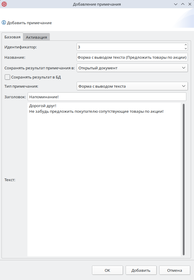 - Товар. Штрих-код товара, при добавлении которого будет выполнено примечание.