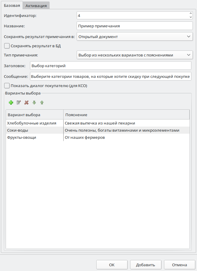 - Тип открытого документа. Тип открытого документа, в котором будет выполнено примечание при добавлении позиции.