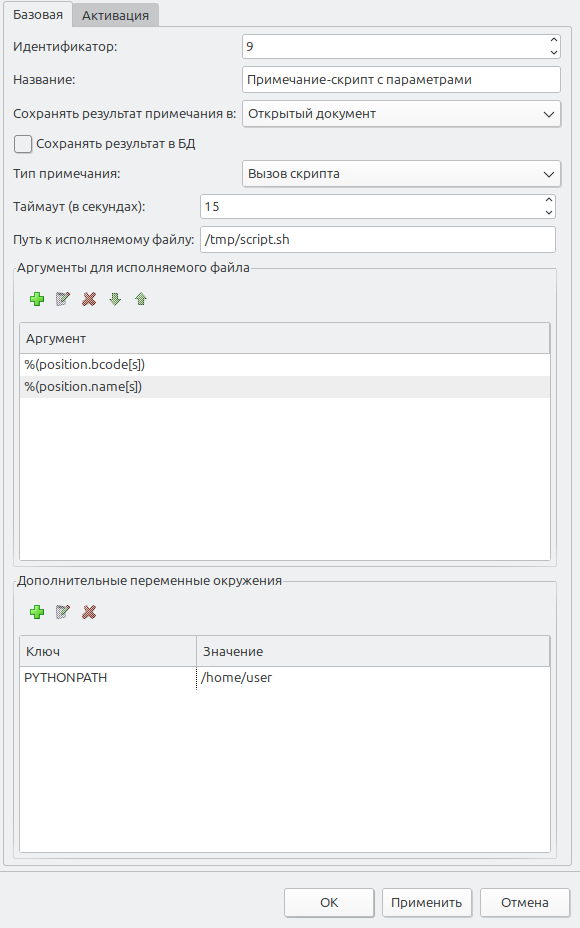 - Таймаут (в секундах). Ограничение времени работы по таймауту. Если при истечении таймаута скрипт не завершил работу, то выполнение скрипта будет прервано, результат примечания не будет получен.