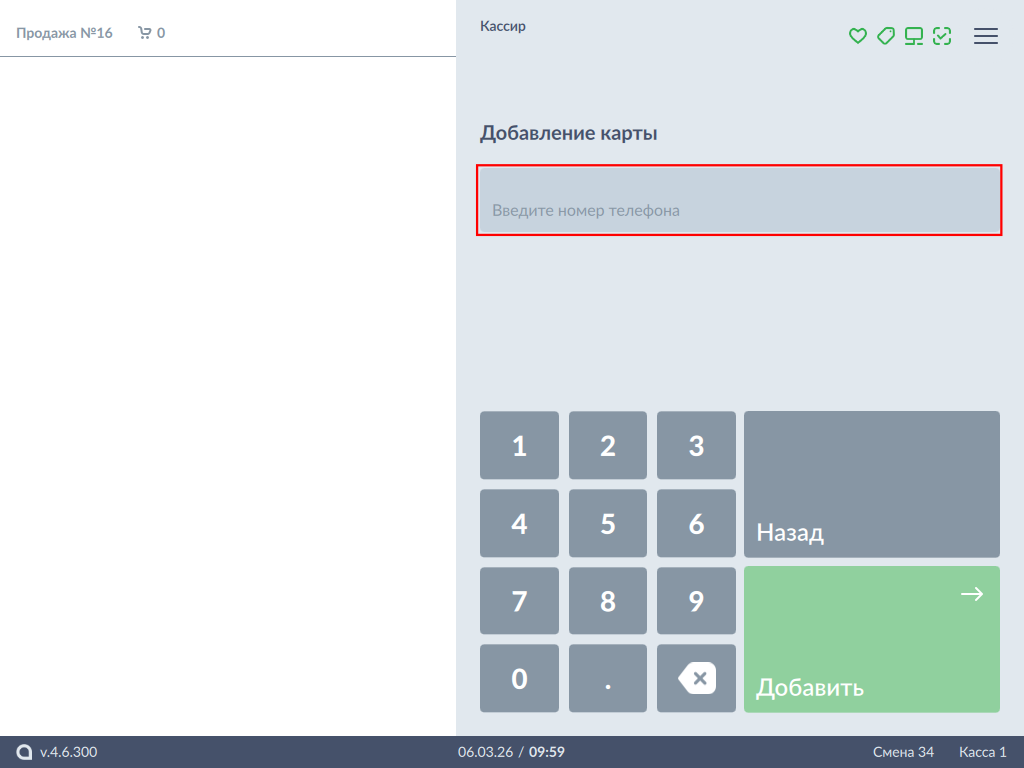 4. Если для введенного номера телефона карта не будет найдена, то на экран будет выведено окно для создания нового клиента: