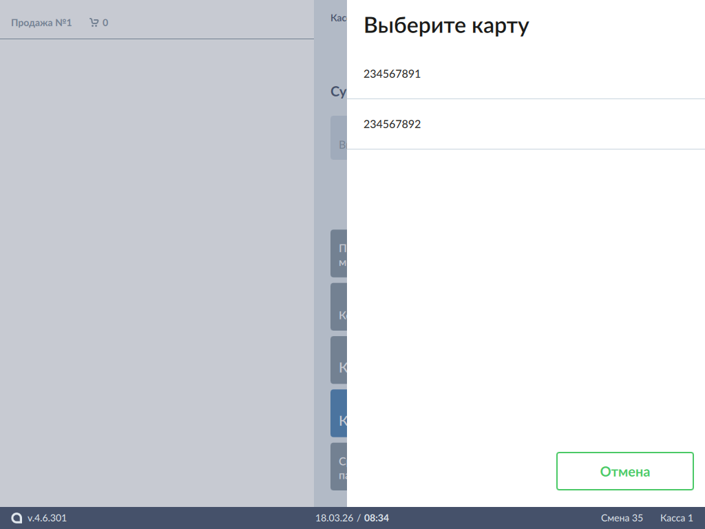 Введите корректные данные покупателя и нажмите кнопку "Сохранить", карта будет добавлена в чек. Для отказа от операции нажмите "Отмена".