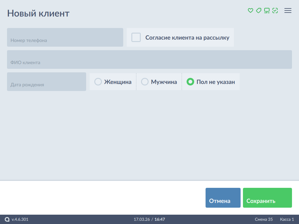 5. Заполнить данные клиента. Настройками программы предусмотрена возможность отключения отображения полей для ввода данных покупателя (ФИО клиента, дата рождения, пол и согласие клиента на рассылку):