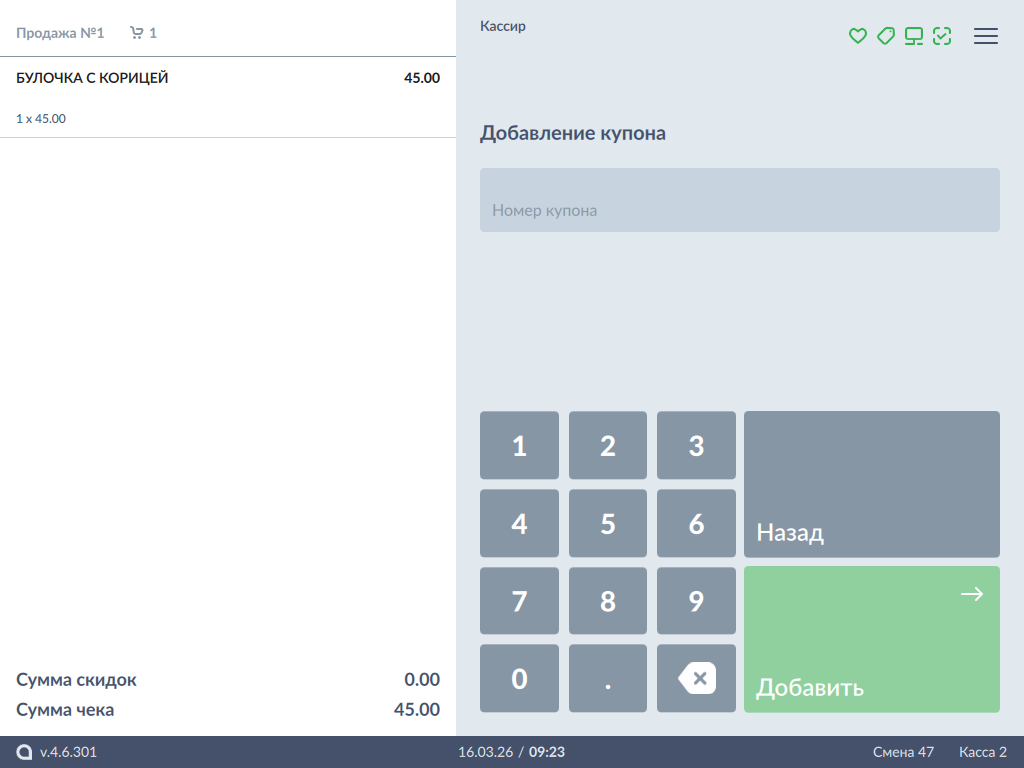 Добавление купона в чек осуществляется несколькими способами: