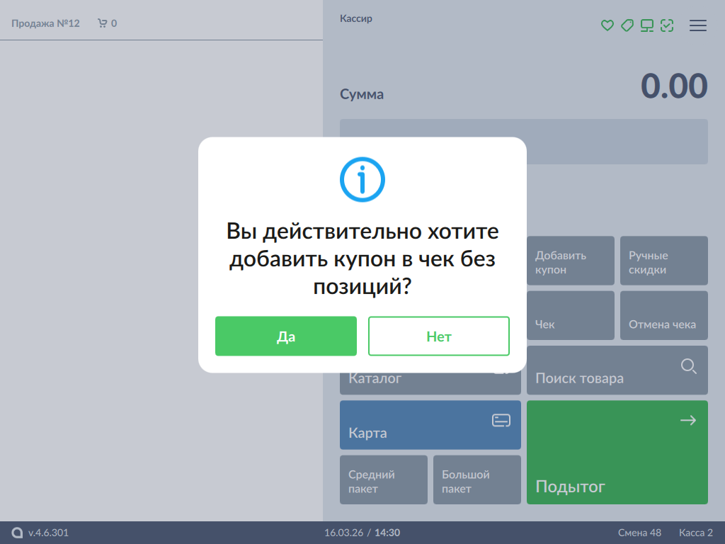 Нажмите кнопку "ОК", чтобы закрыть окно. Купон не будет добавлен в чек.