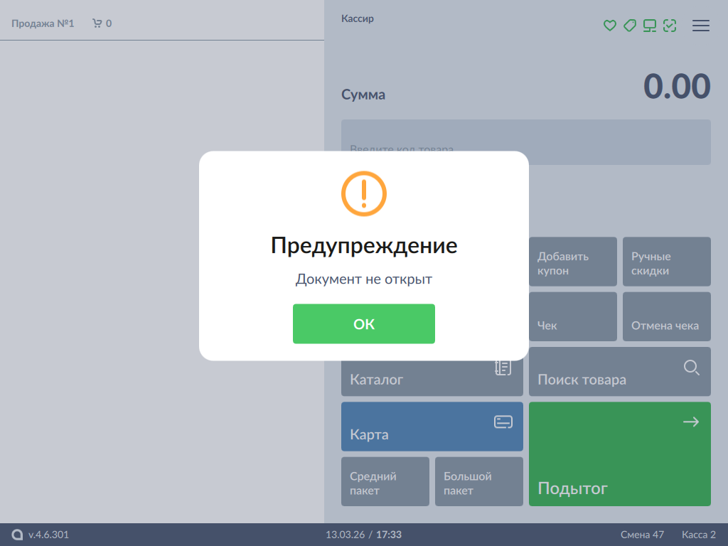 При попытке добавить купон в неоткрытый документ по кнопке на экран будет выведена ошибка: