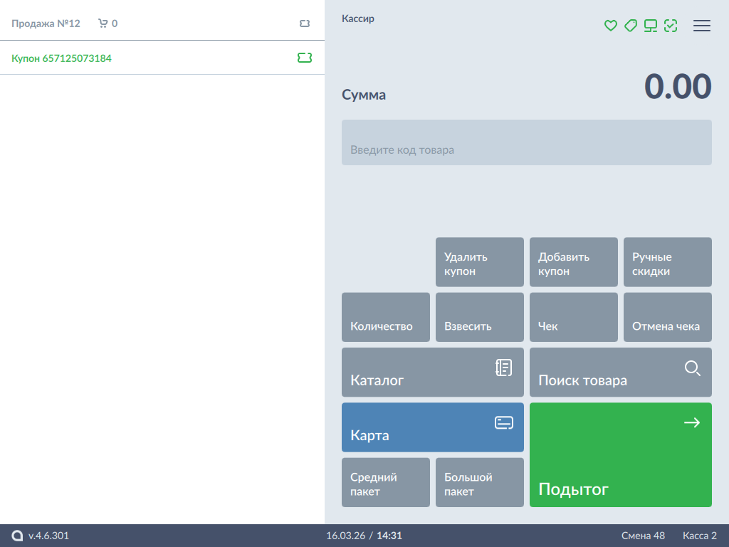 Введите штрих-код купона (вручную или при помощи сканера), нажмите кнопку "Добавить".