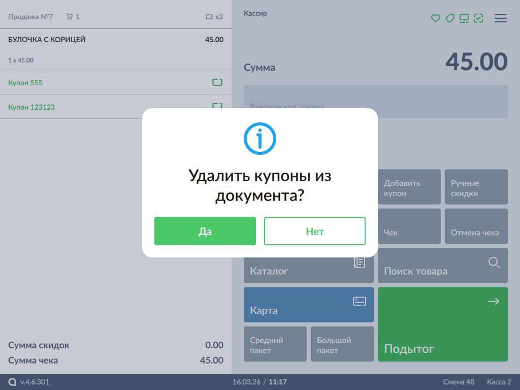 Нажмите "Да" для удаления купона или "Нет" для сохранения купона в чеке. После того, как купон удален из чека, примененная скидка отменяется.
