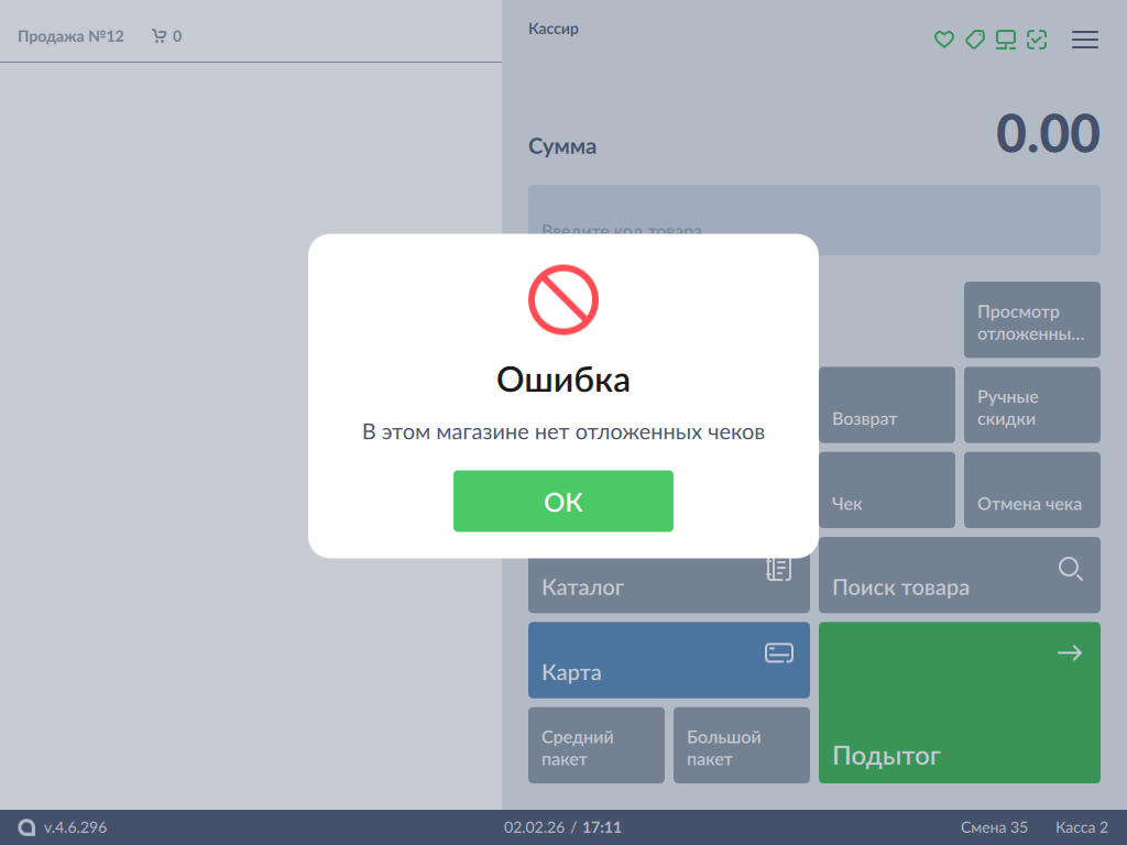 - Если в магазине нет отложенных чеков, которые ранее не были оплачены или сторнированы, то при нажатии кнопки "Просмотр отложенных чеков" на экран будет выведена ошибка: