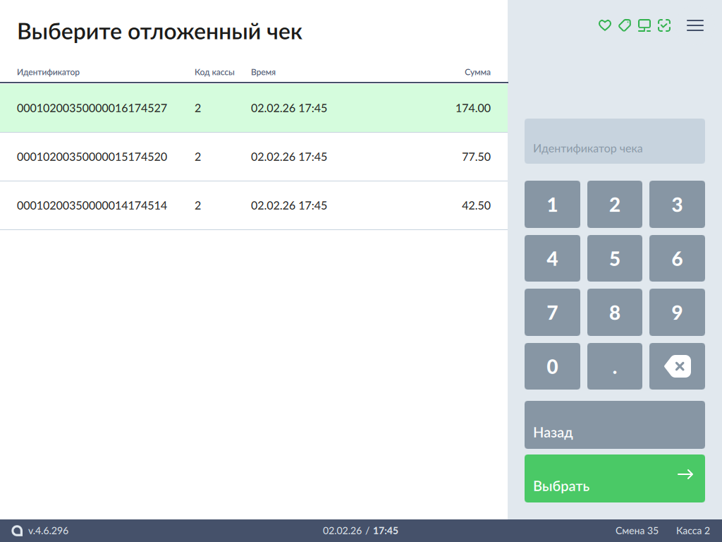 Любой чек может быть временно отложен, а затем восстановлен для выполнения дополнительных операций с документом и произведения оплаты.