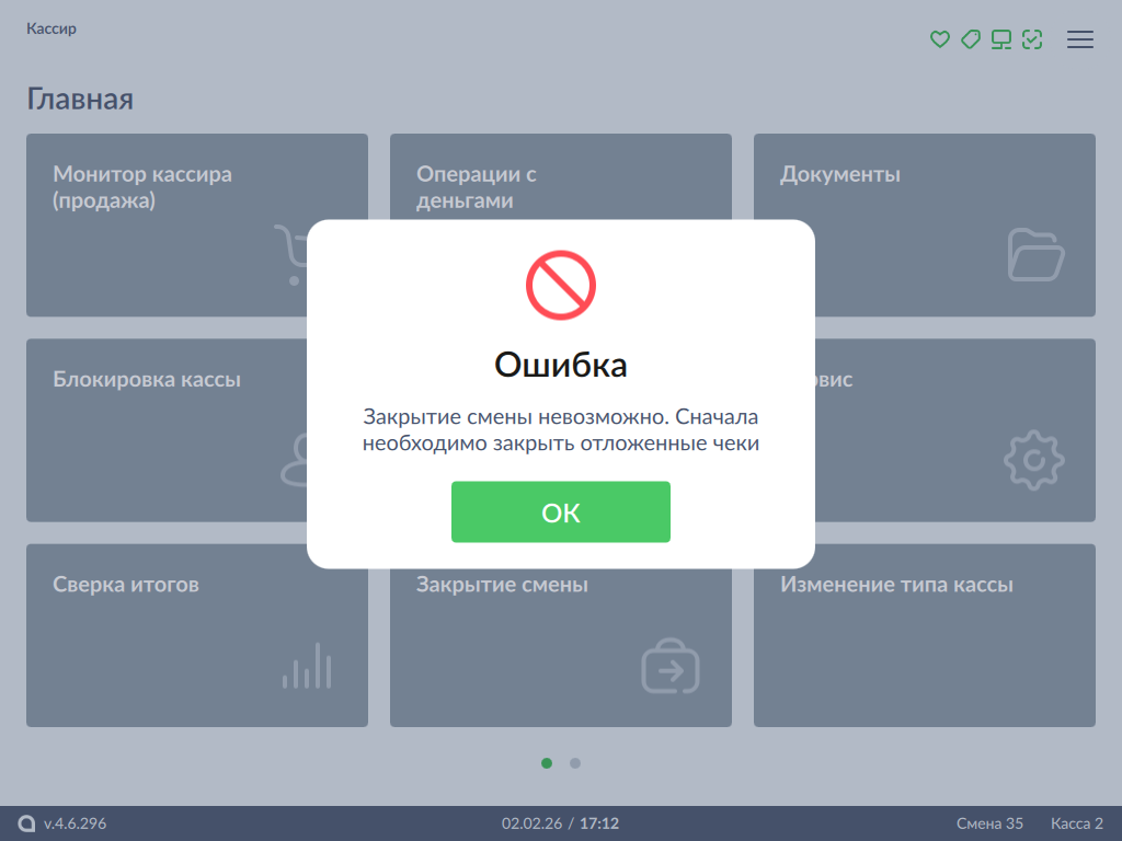Для того чтобы закрыть сообщение нажмите кнопку "ОК". - Просмотреть отложенные чеки при наличии на кассе уже открытого чека нельзя. При нажатии кнопки "Просмотр отложенных чеков" на экран будет выведена ошибка: