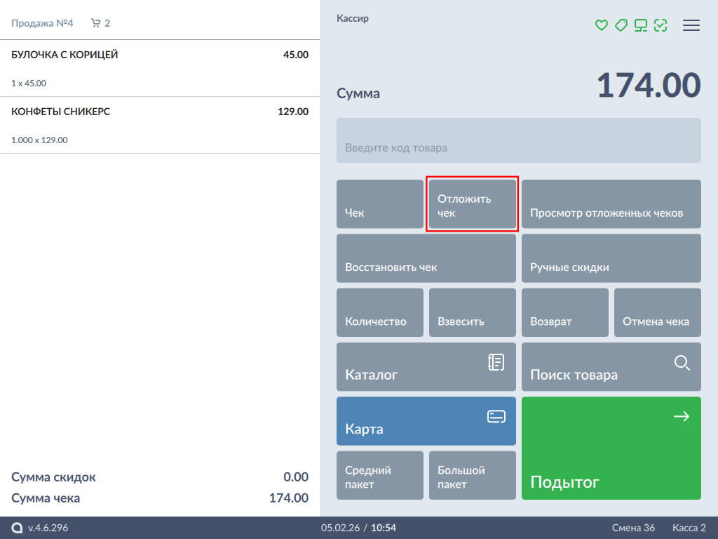 Отложить чек можно в режиме формирования товарной части чека или в подытоге, если в документ еще не добавлены оплаты.