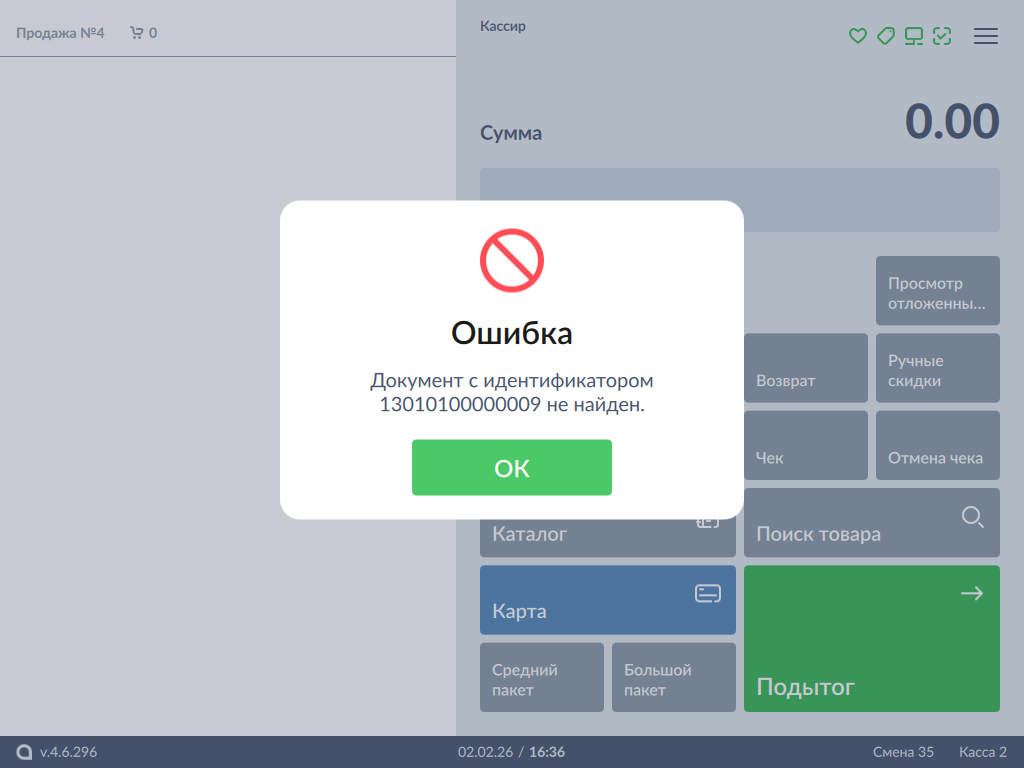 Для закрытия сообщение нажмите кнопку "ОК". Обратитесь к техническому специалисту для решения проблемы. - Отложенный чек не найден на кассовом сервере. При попытке восстановления на экран будет выведено сообщение:
