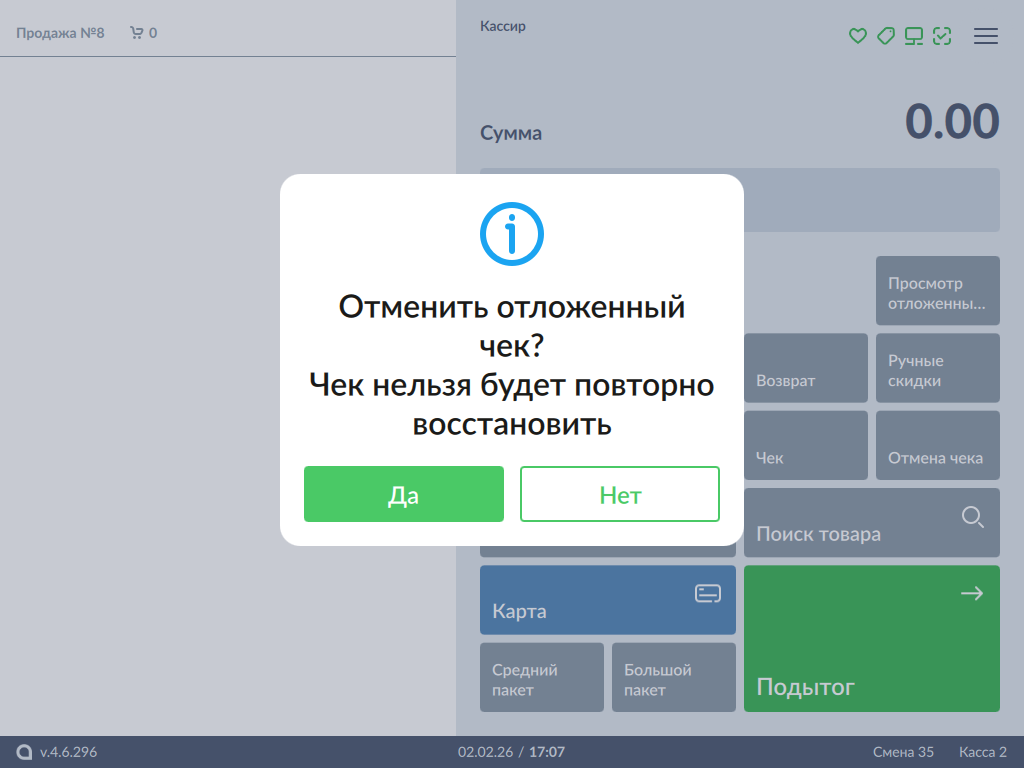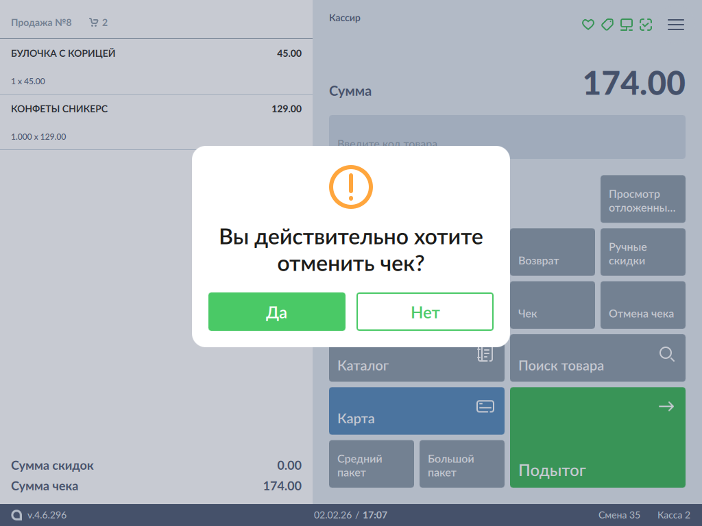 В случае подтверждения чек будет отменен без возможности восстановления. При отмене операции чек будет сторнирован, но при необходимости его можно восстановить повторно.