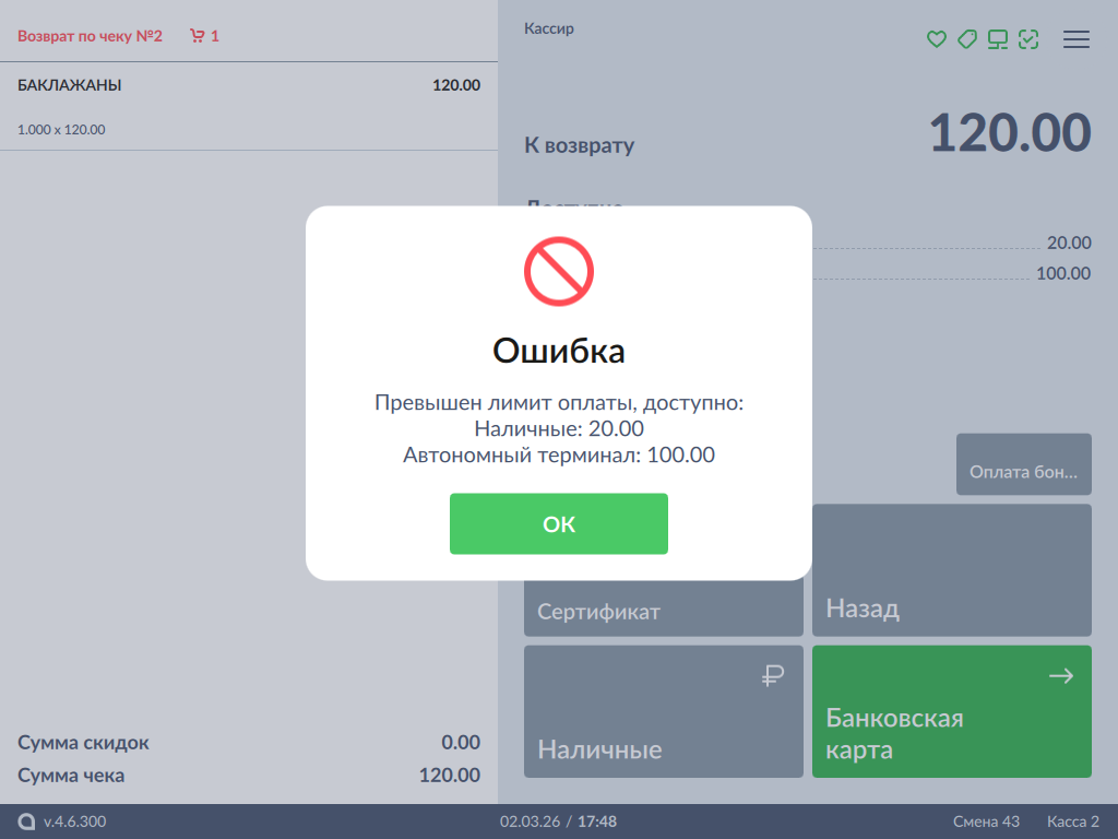 5. Если сумма возврата в конкретной валюте превышает сумму в денежном ящике, то добавление оплаты будет запрещено, а на экран будет выведена ошибка и сумма в денежном ящике: