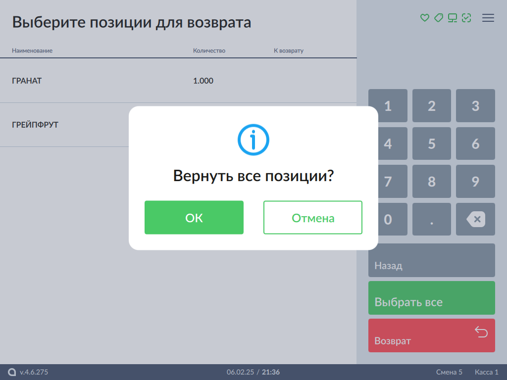 5. Нажмите кнопку "ОК" для перехода к чеку возврата или "Отмена" для возвращения к выбору позиций для возврата.
