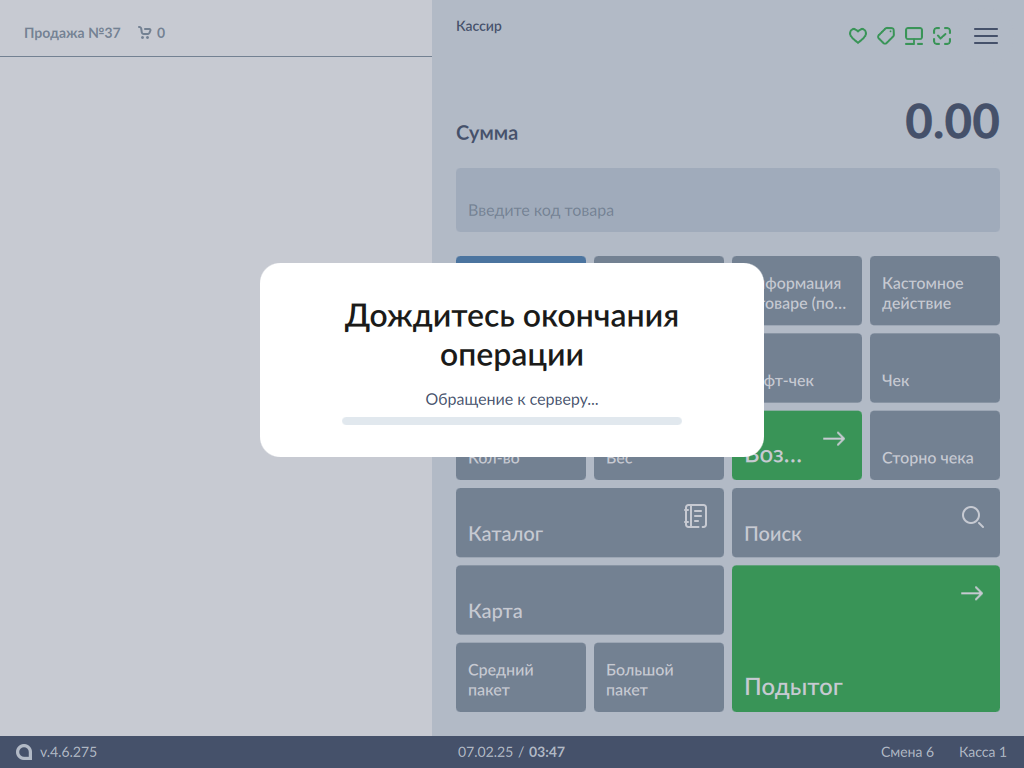• Если на кассе настроена возможность перехода в подытог по карте, то при переходе к оплате по безналичному расчету на экран будет выведено соответствующее предупреждение.