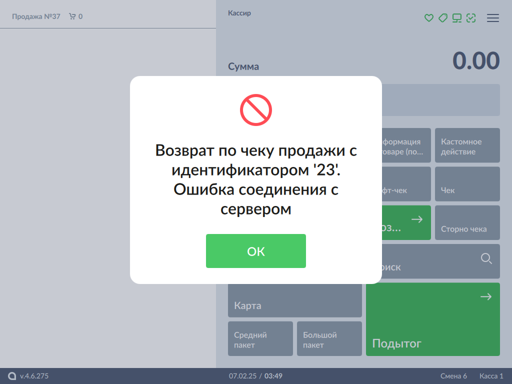 Нажмите кнопку "ОК" и продолжите работу с чеком возврата.