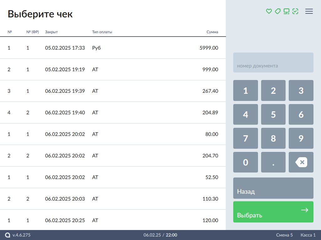 Для выбора чека используйте вертикальный свайп или поиск по номеру смены. Подтвердите выбор нажатием кнопки "Выбрать".