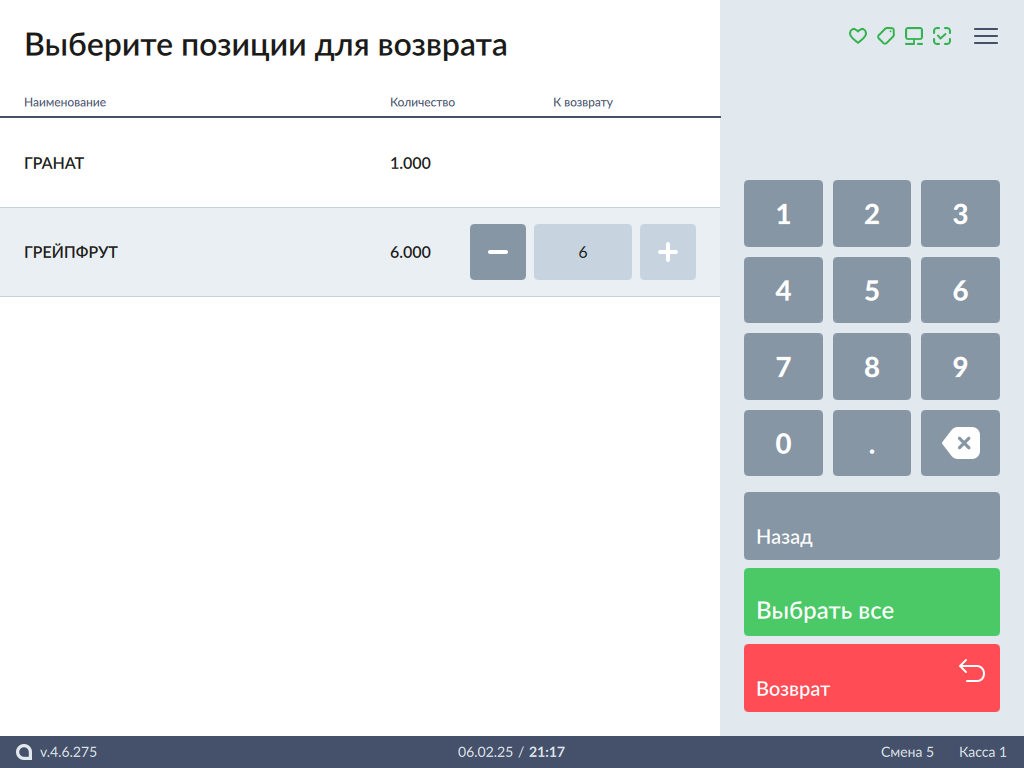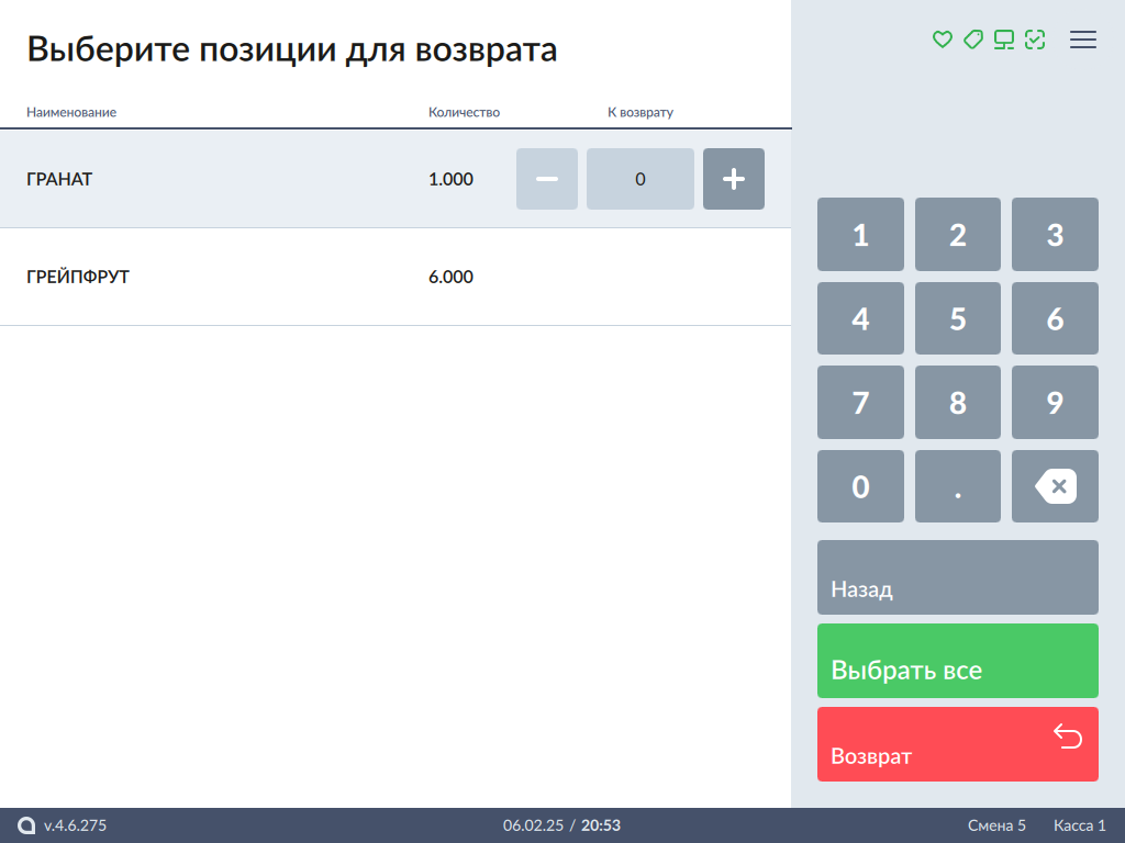 1. В окне выбора позиций для возврата отображается полный перечень товаров из чека продажи с указанием количества, которое было продано: