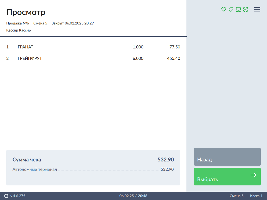 Просмотр чека продажи на другой кассе недоступен, поэтому сразу после выбора чека программа перейдет к выбору позиций для возврата или формированию чека возврата в соответствии с тем, как это задано настройками программы.