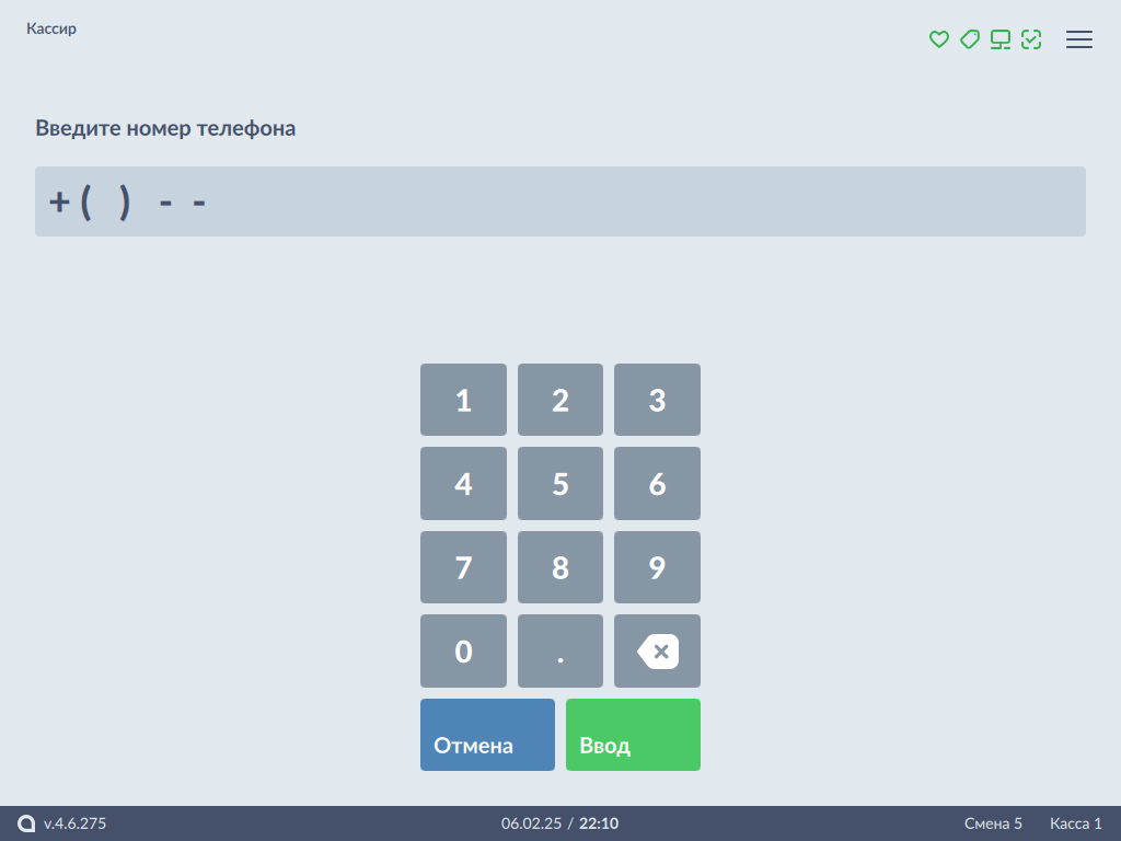 • Окно для ввода номера телефона покупателя: