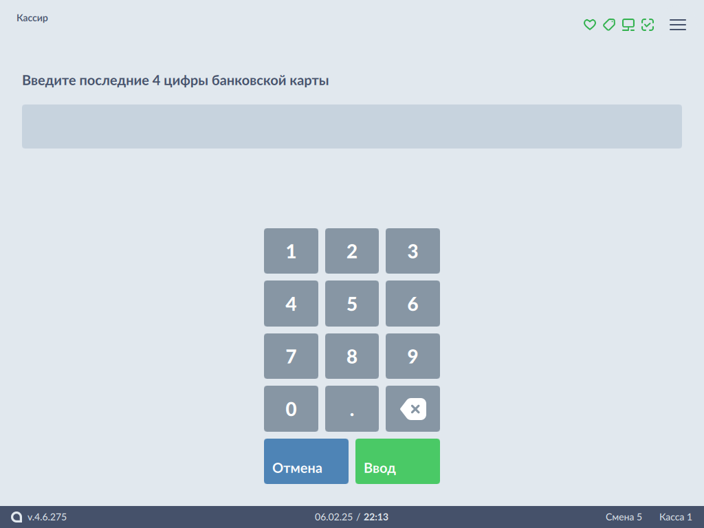 • Окно для ввода последних 4 цифр банковской карты, которой был оплачен чек продажи: