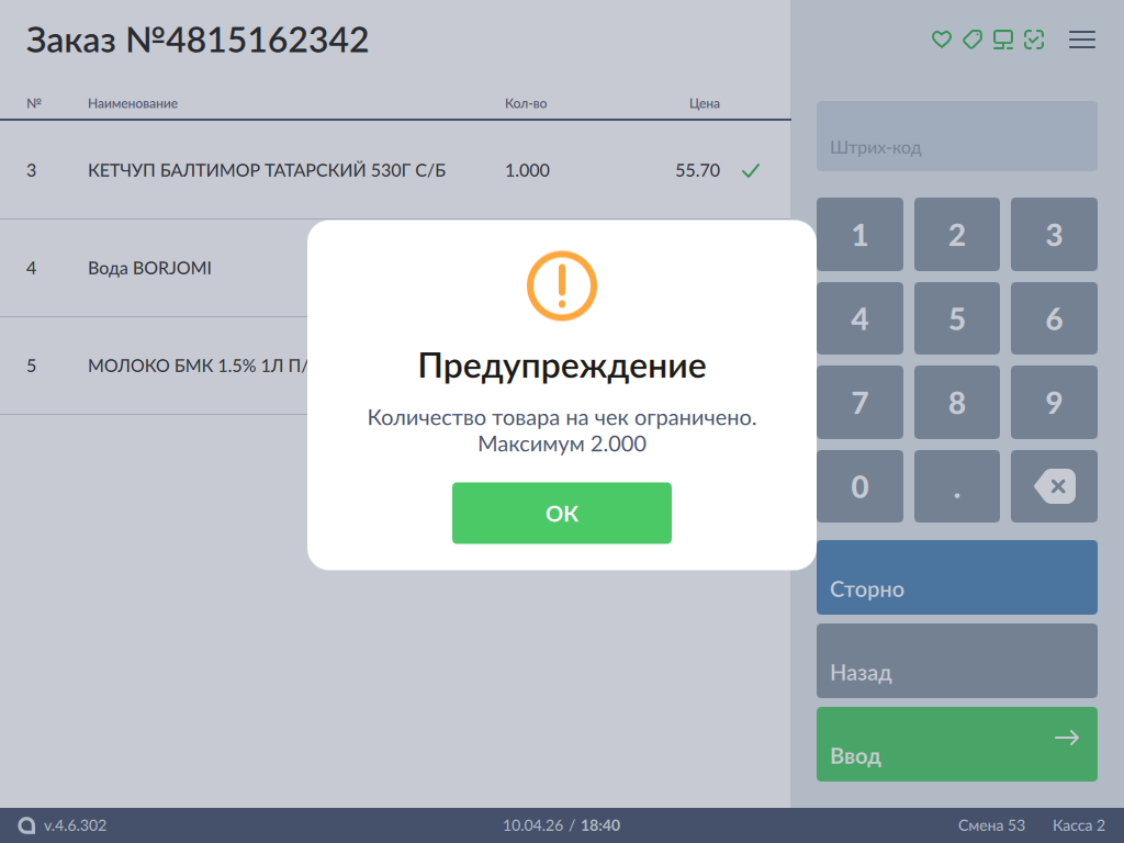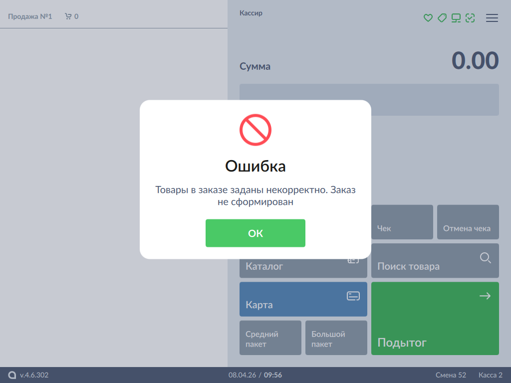 Нажмите "ОК", чтобы закрыть сообщение. Чек продажи сформирован, товары сверх лимита удалены из чека. - при восстановлении софт-чека с заказом (с акцизными товарами) на экран будет выведена ошибка: