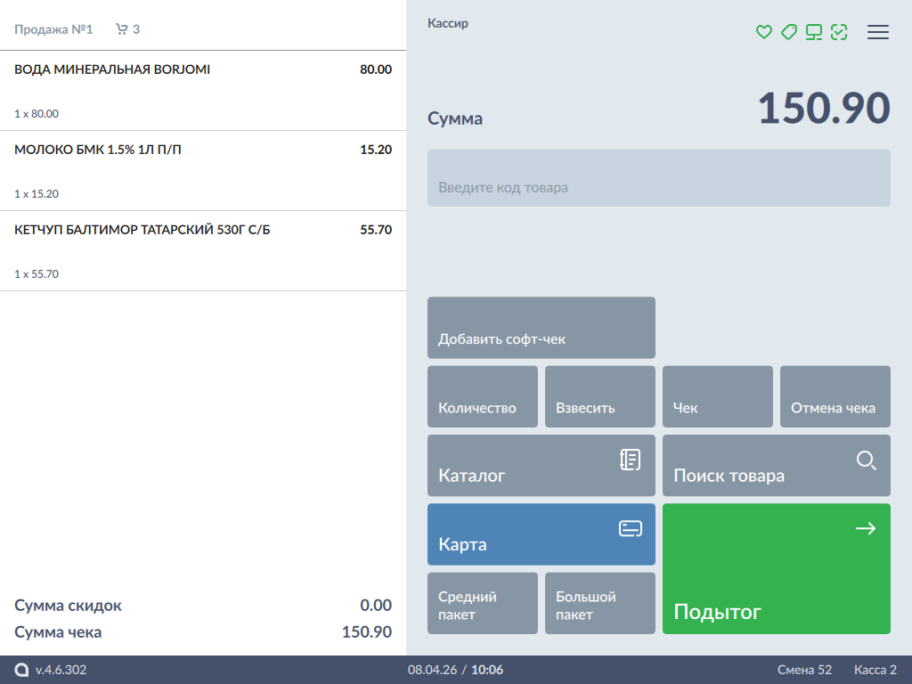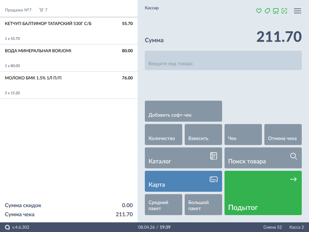 Товары из софт-чека могут быть добавлены в чек продажи даже в том случае, если в чек уже были добавлены другие товары. После добавления товаров из софт-чека можно продолжить работу с чеком – добавлять новые товары, выполнять сторнирование, применять модификаторы, добавлять карты и т.д. Софт-чек может быть добавлен в чек продажи один раз, после закрытия чека продажи софт-чек помечается как проданный, после чего его нельзя добавить в чек продажи повторно.