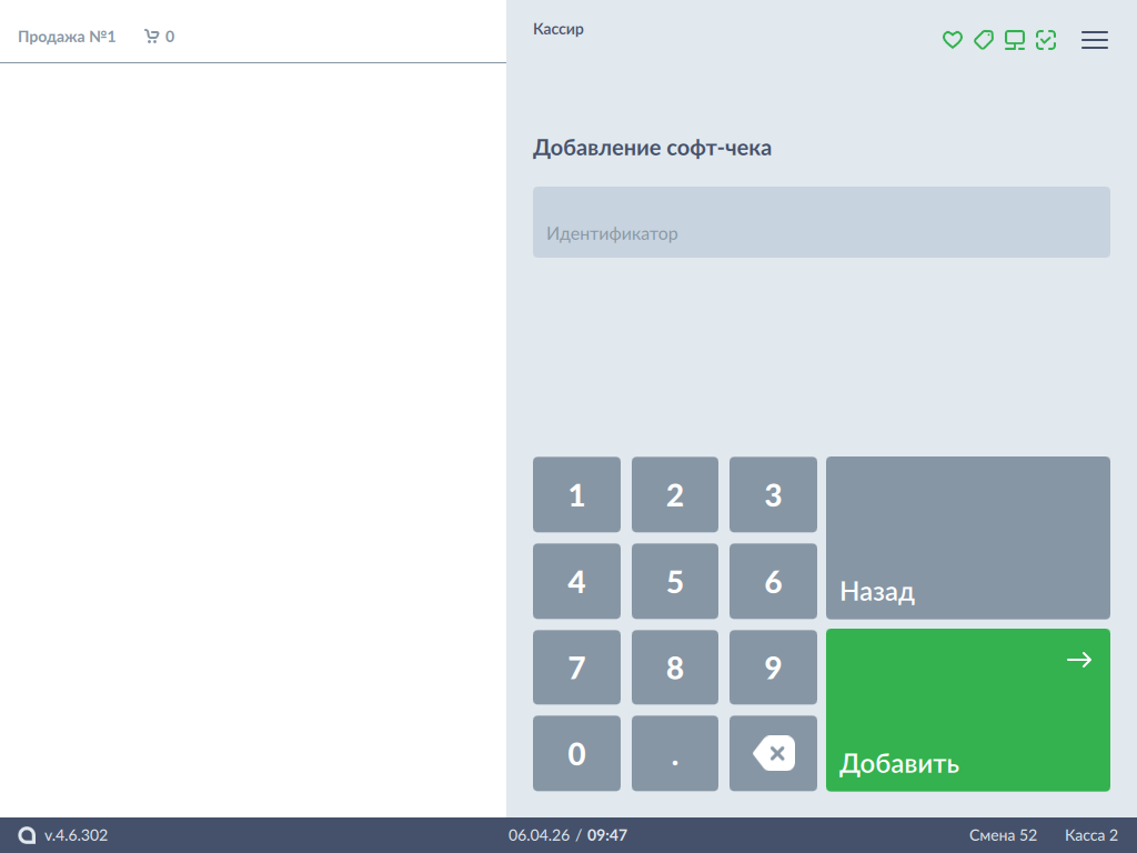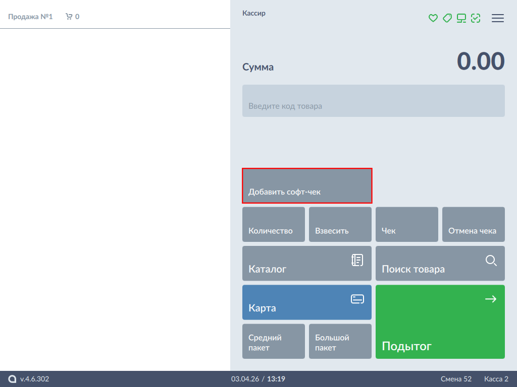 Софт-чек добавляется в чек продажи вручную или при помощи сканера.