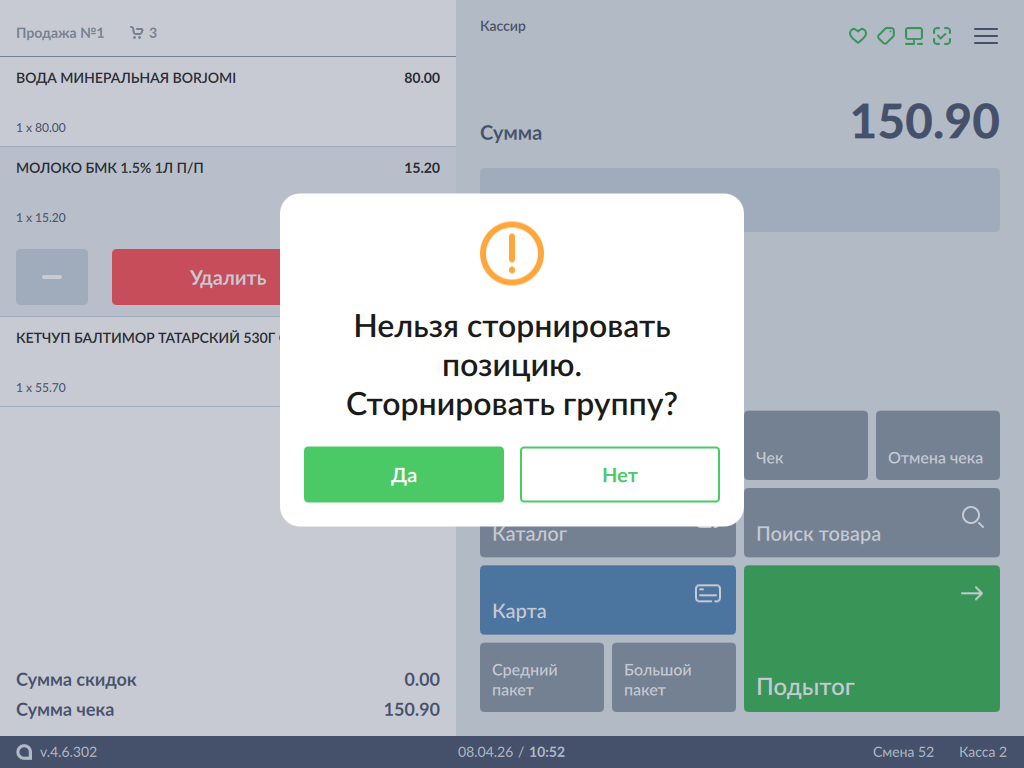 Нажмите "ОК", чтобы закрыть сообщение, и попробуйте добавить софт-чек повторно. Если повторная попытка не удалась, обратитесь в службу технической поддержки. Если настройками софт-чека запрещено сторнирование отдельной позиции, то при попытке удаления какой-либо позиции на экран будет выведено сообщение: