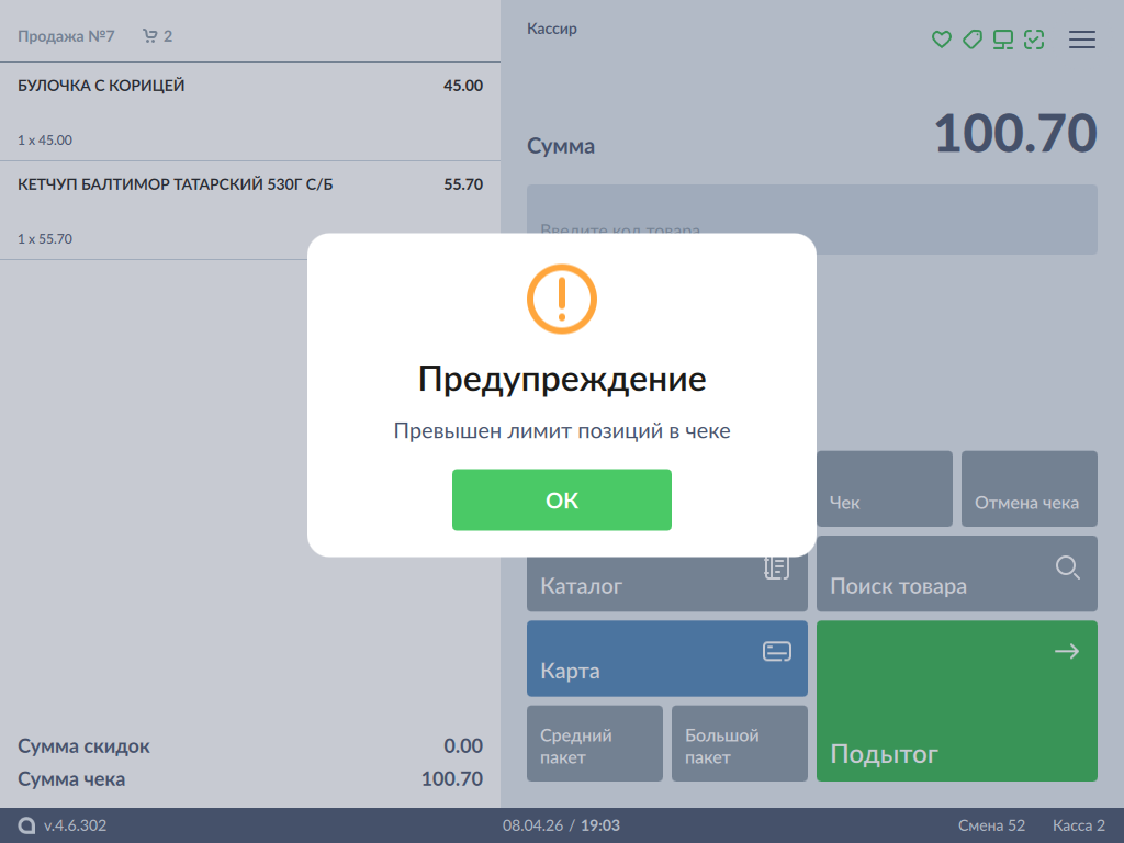Настройками программы может быть предусмотрено ограничение количества позиций в чеке.