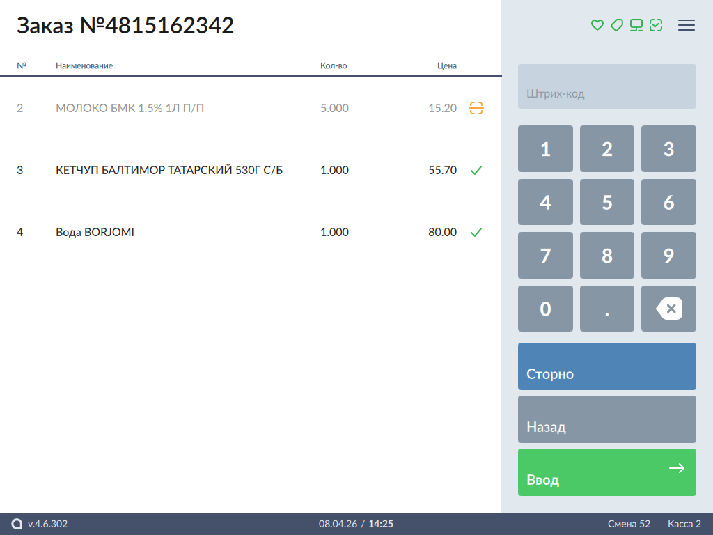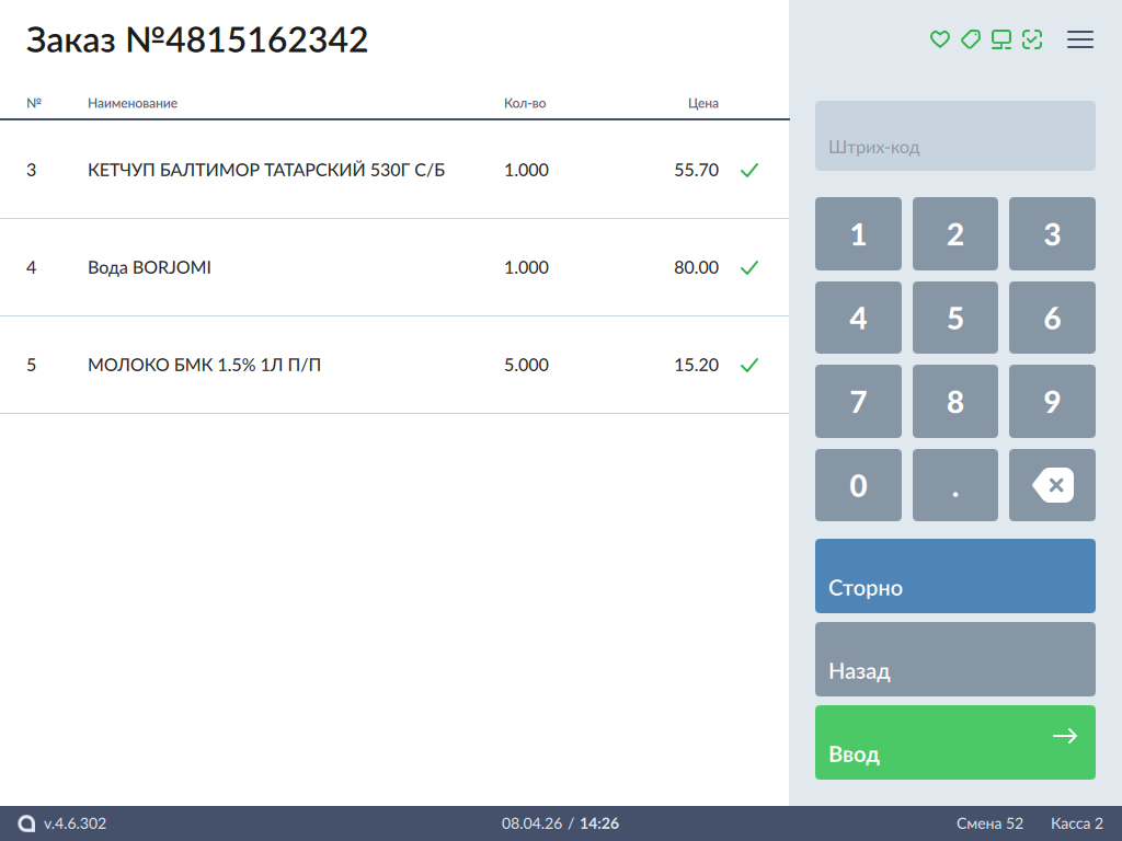 Нажмите кнопку "Назад", чтобы выйти из заказа.- Товары, помеченные сканером штрих-кода, необходимо сканировать для добавления в чек продажи, считав штрих-код товара сканером или введя код товара в поле ввода и нажав кнопку "Ввод". После сканирования товар будет перемещен в конец списка товаров в заказе.