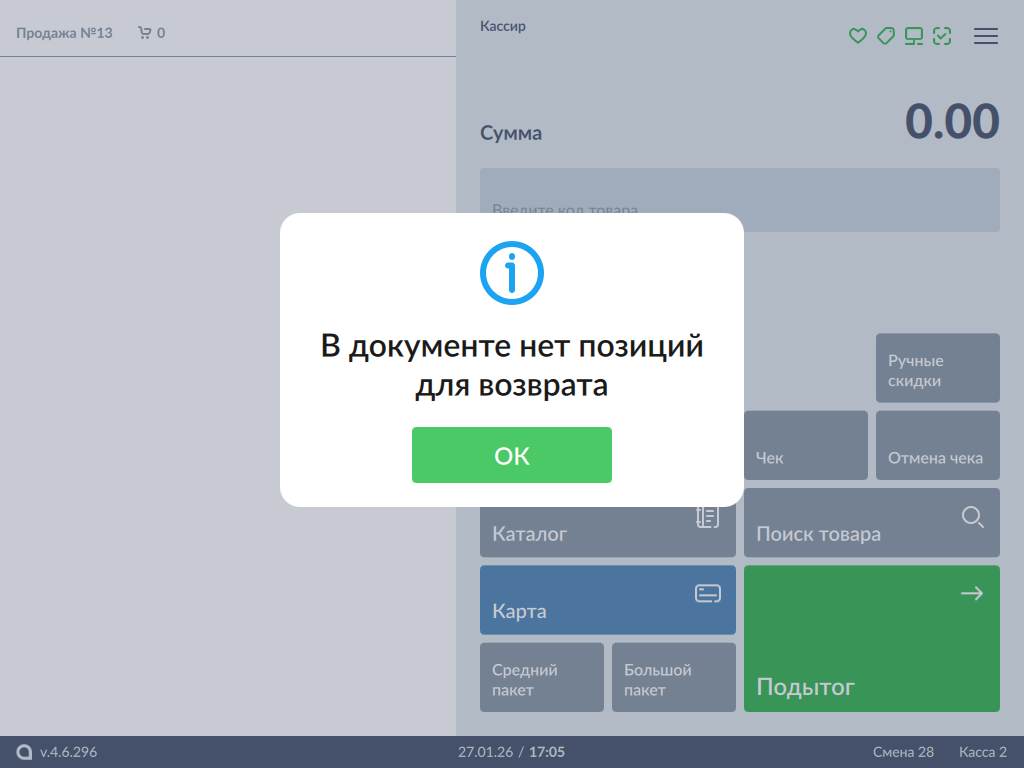 Нажмите "ОК" для возврата в режим продажи.