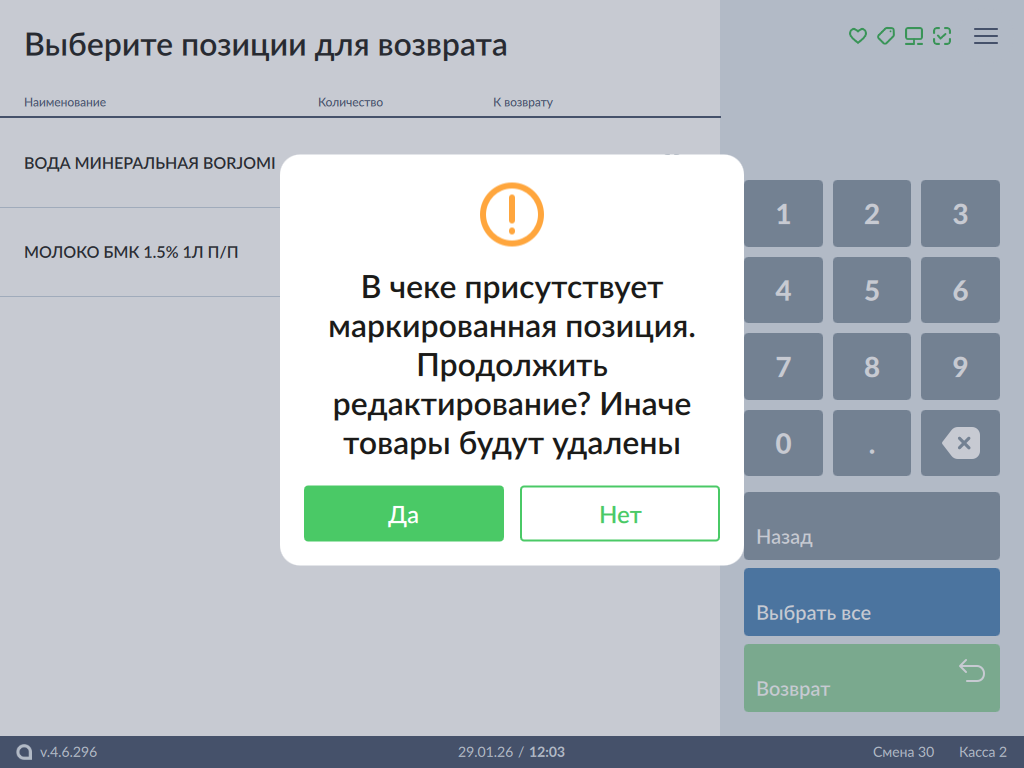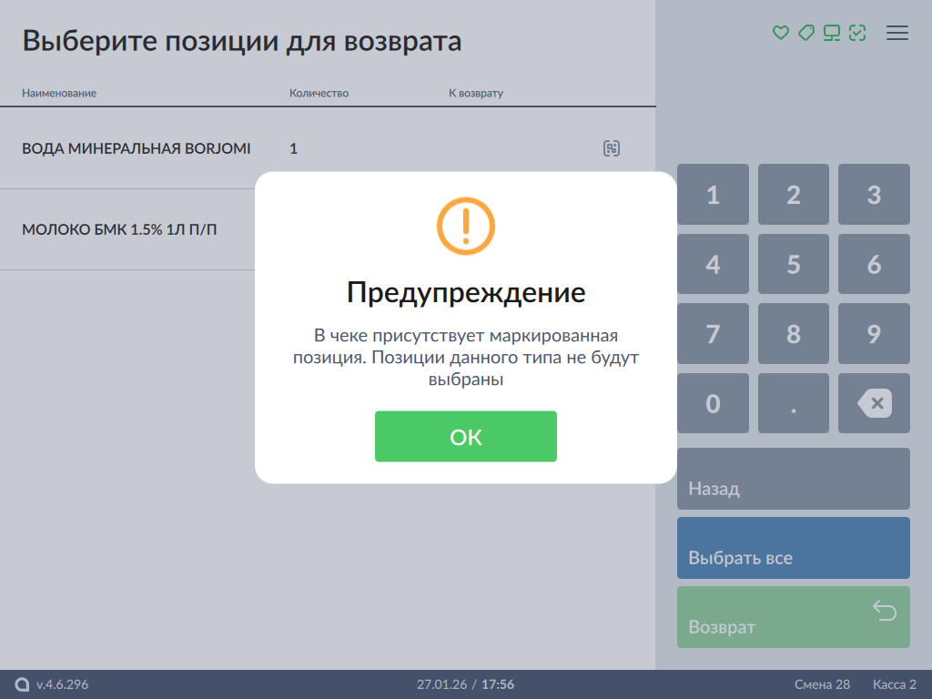 - Если режим выбора позиций отключен, то при переходе в режим формирования чека возврата все маркированные товары будут удалены, на экран будет выведено предупреждение: