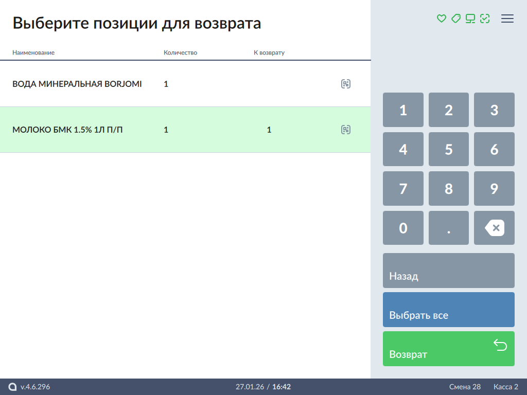 - После выбора всех товаров, которые необходимо вернуть, нажмите кнопку "Возврат". Товары будут добавлены в чек возврата: