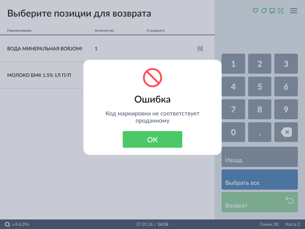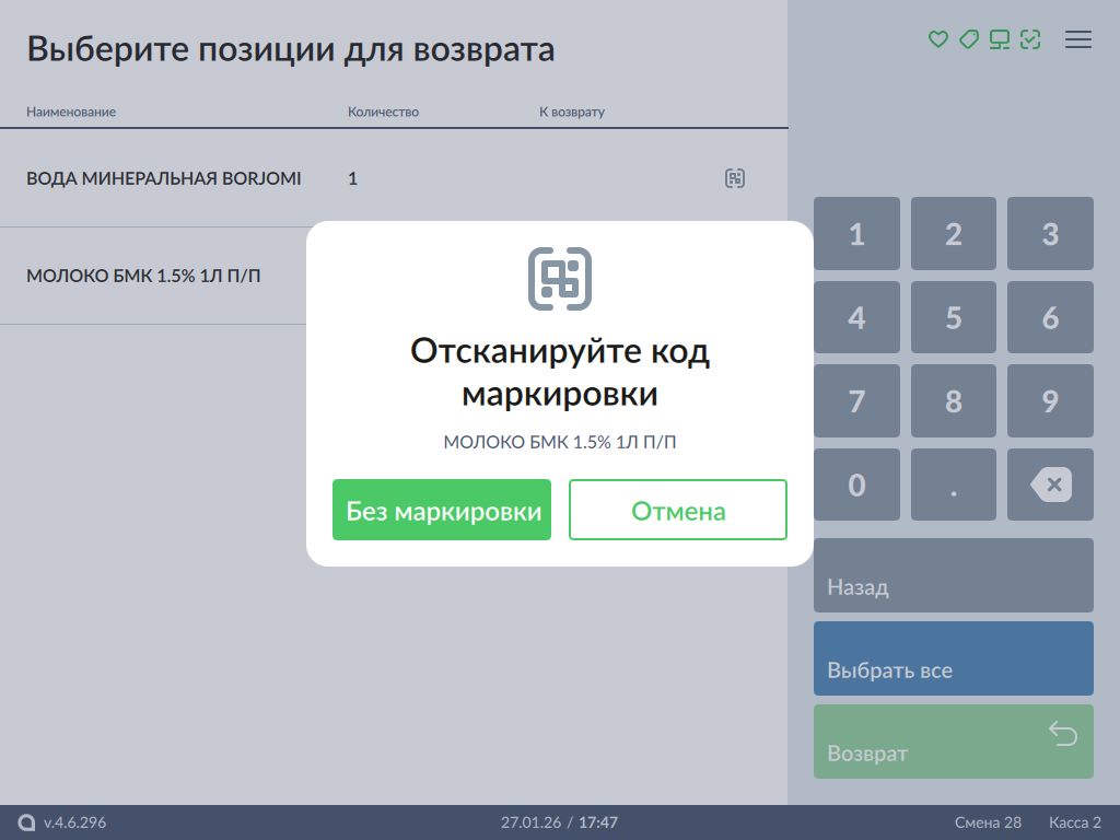 Маркированные товары добавляются в чек возврата так же, как и в чек продажи. Более подробно о продаже маркированных товаров можно прочитать в разделе "Продажа маркированных товаров".