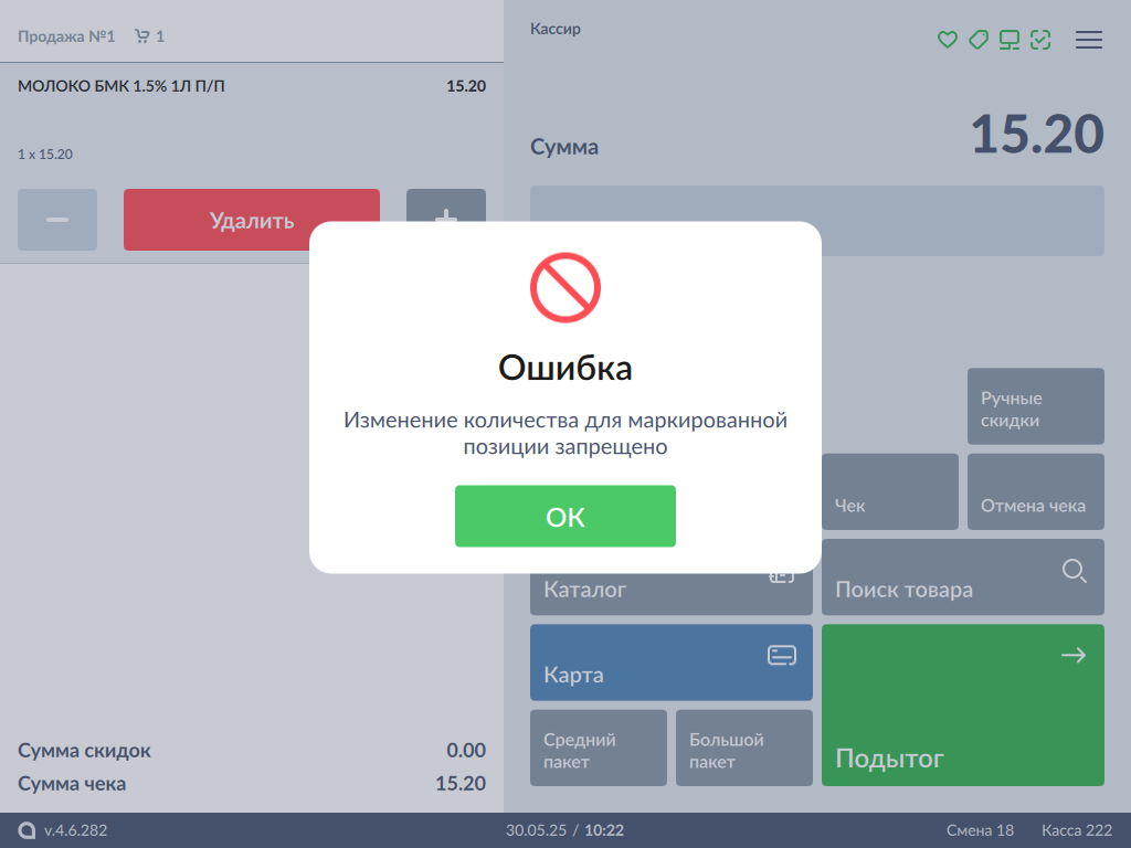 Необходимо подтвердить ошибку и повторить сканирование кода маркировки. После закрытия диалога сканер будет разблокирован. Каждую единицу маркированного товара с кодом маркировки нужно добавлять отдельно, применение модификатора "Изменение количества" для таких товаров запрещено: