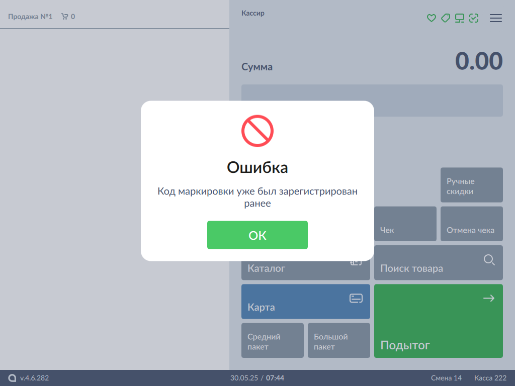 Нажмите кнопку "ОК", чтобы закрыть сообщение, затем последовательно отсканируйте штрих-код товара и код маркировки. - Если в чек добавляется товар, который был продан, то на экран будет выведена ошибка: