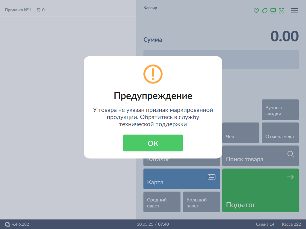 Нажмите кнопку "ОК", чтобы закрыть сообщение, и продолжите формирование товарной части чека. - Если товар по коду маркировки не найден, то на экран будет выведено предупреждение: